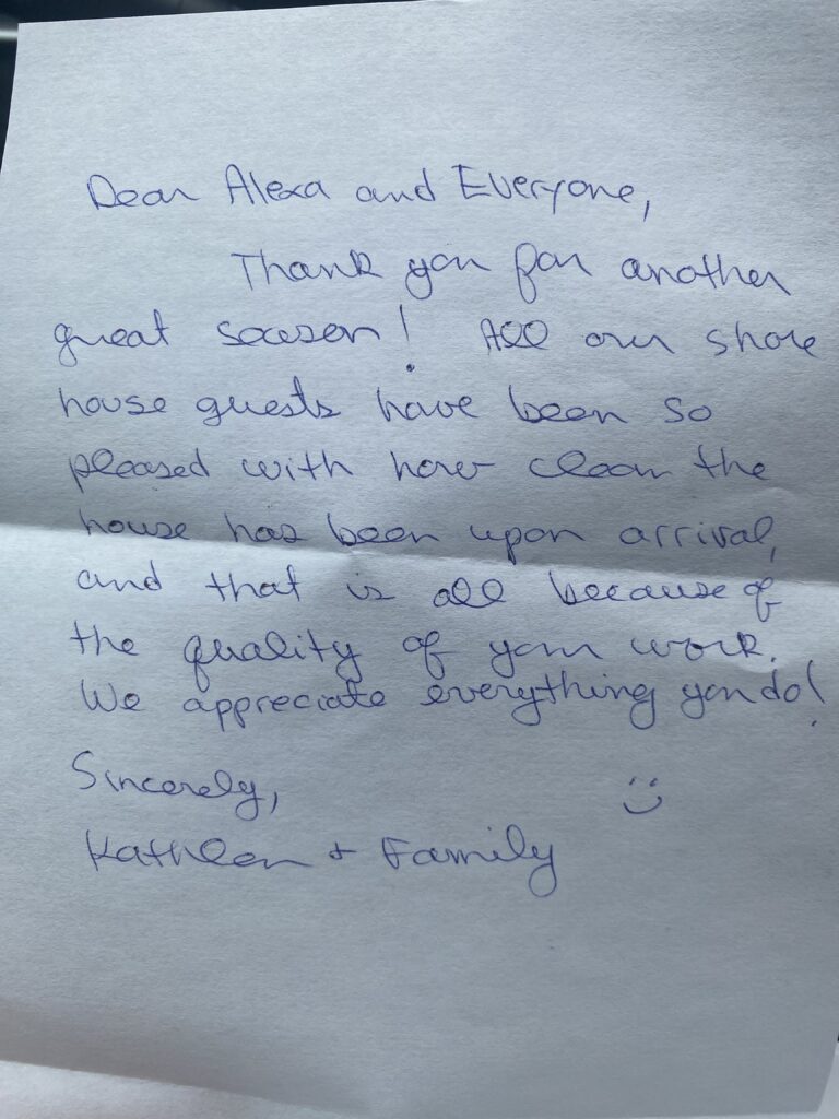 Thank you for another great season! All our shore house guests have been so pleased with how clean the house has been upon arrival, and that is all because of the quality of your work. We appreciate everything you do!